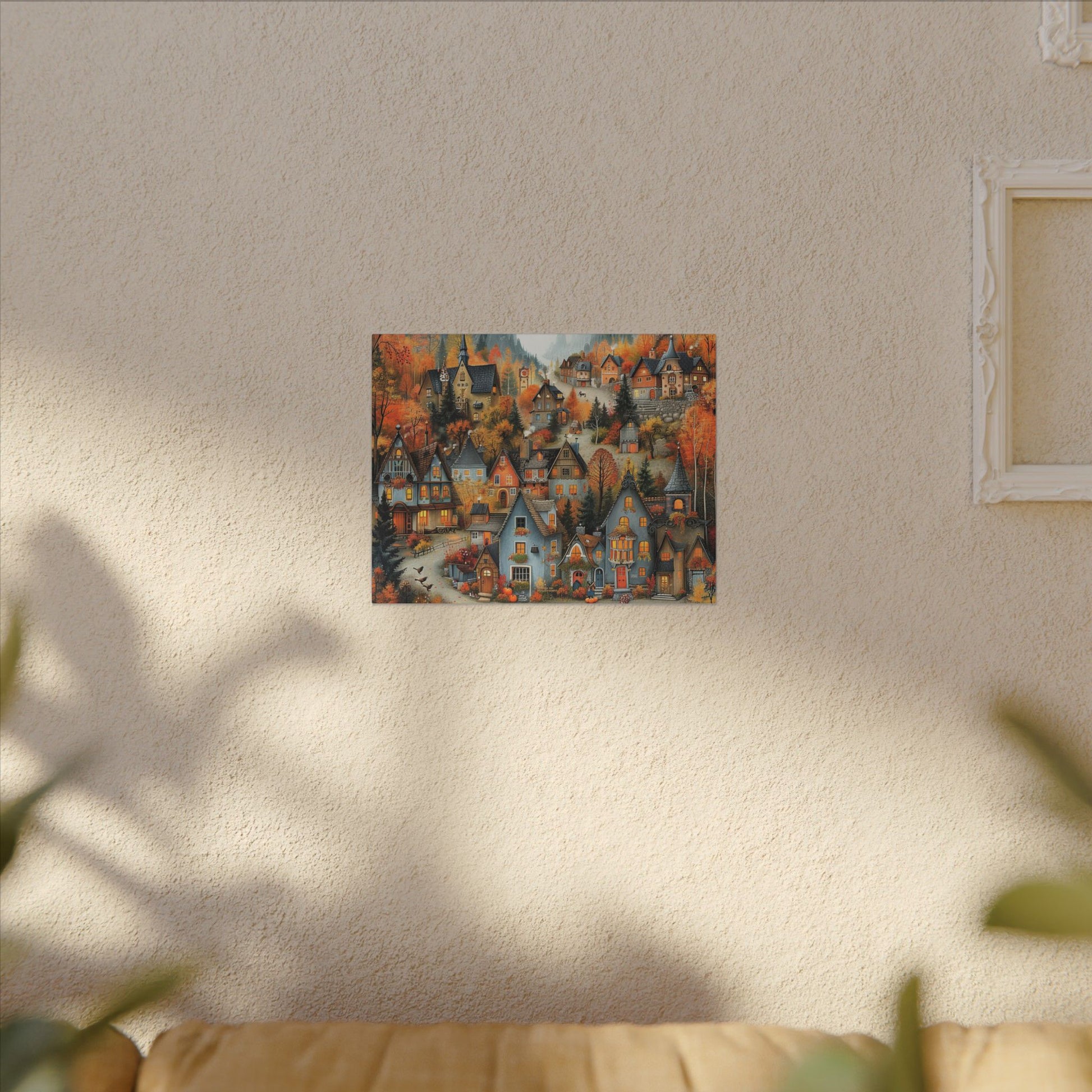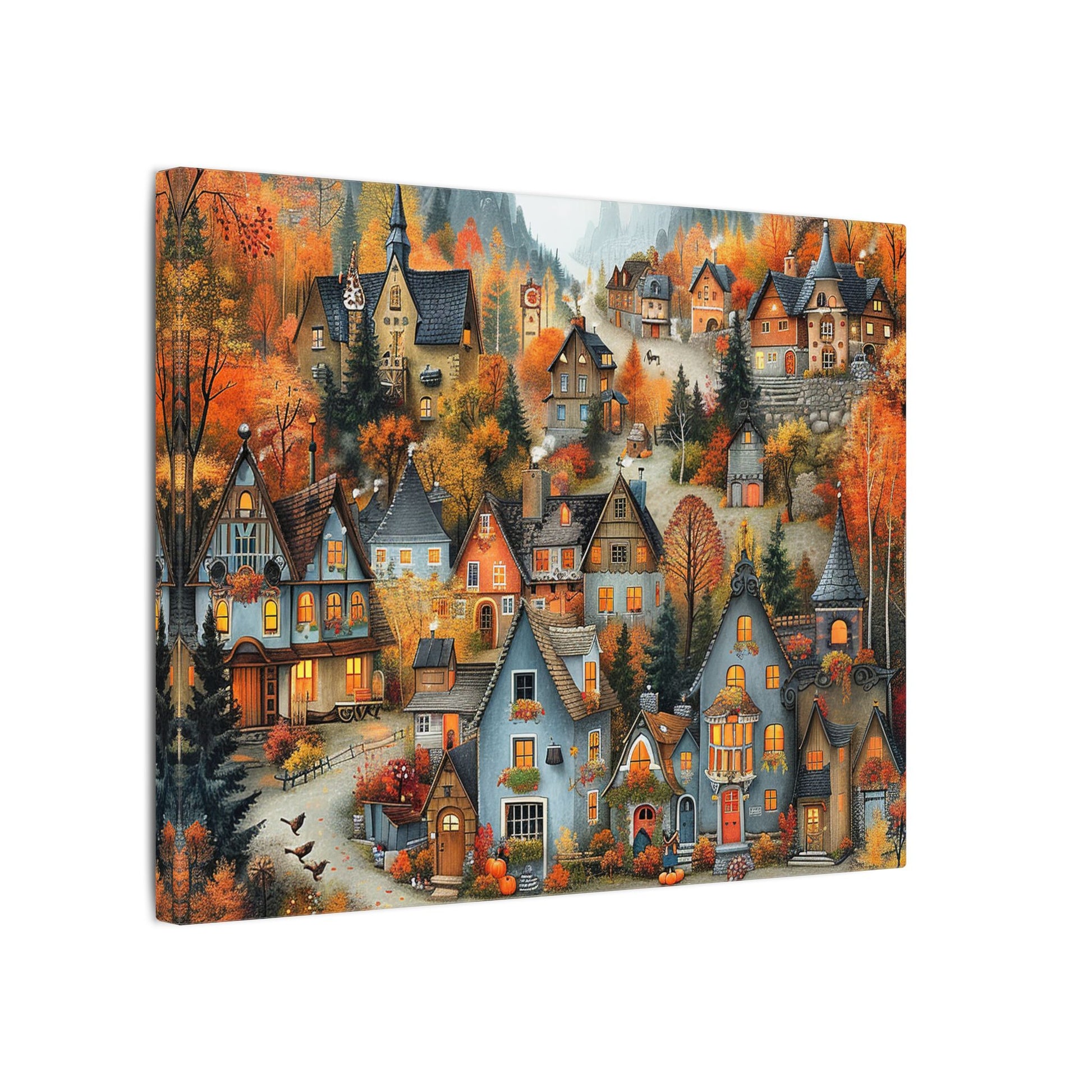 Bring the cozy feeling of autumn into your home with this lovely hillside autumn village scene canvas print. Perfect for adding a touch of warmth and nature to any room, this canvas is ideal for those who enjoy peaceful and serene landscapes. Great for decorating during the fall season.