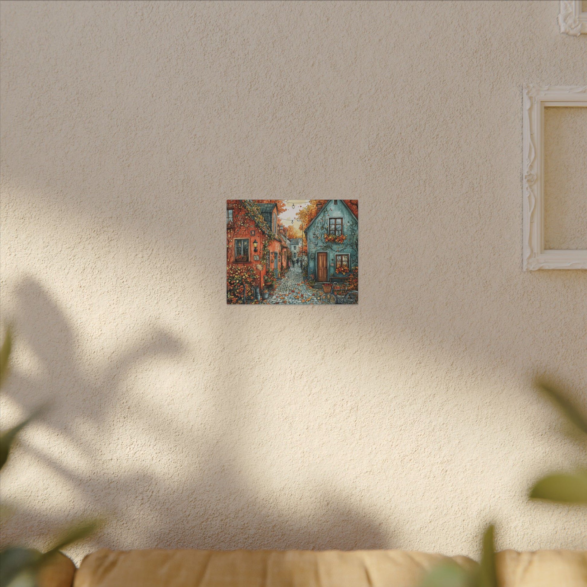 Colorful, quaint fall city scene canvas print that adds a touch of autumn charm to any space. Perfect for those looking to bring a cozy vibe into their home. Ideal for celebrating the fall season.