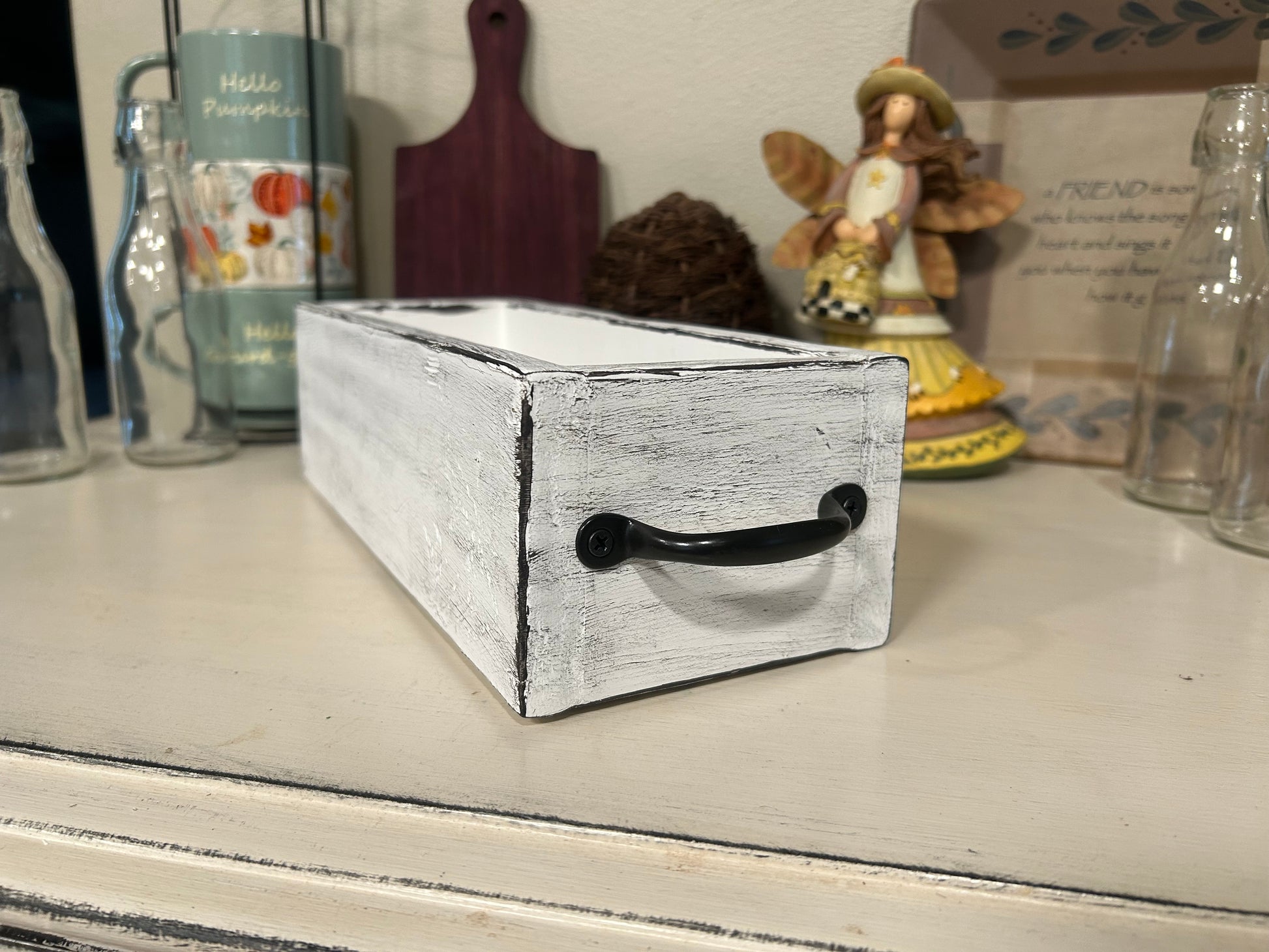 These decorative wood boxes are the perfect for adding jars, floral arrangements or holiday decorations. They are painted with our custom colors of Leathered White and Antique Squire Green. Three-inch black handles adorn each end. They come in two sizes.