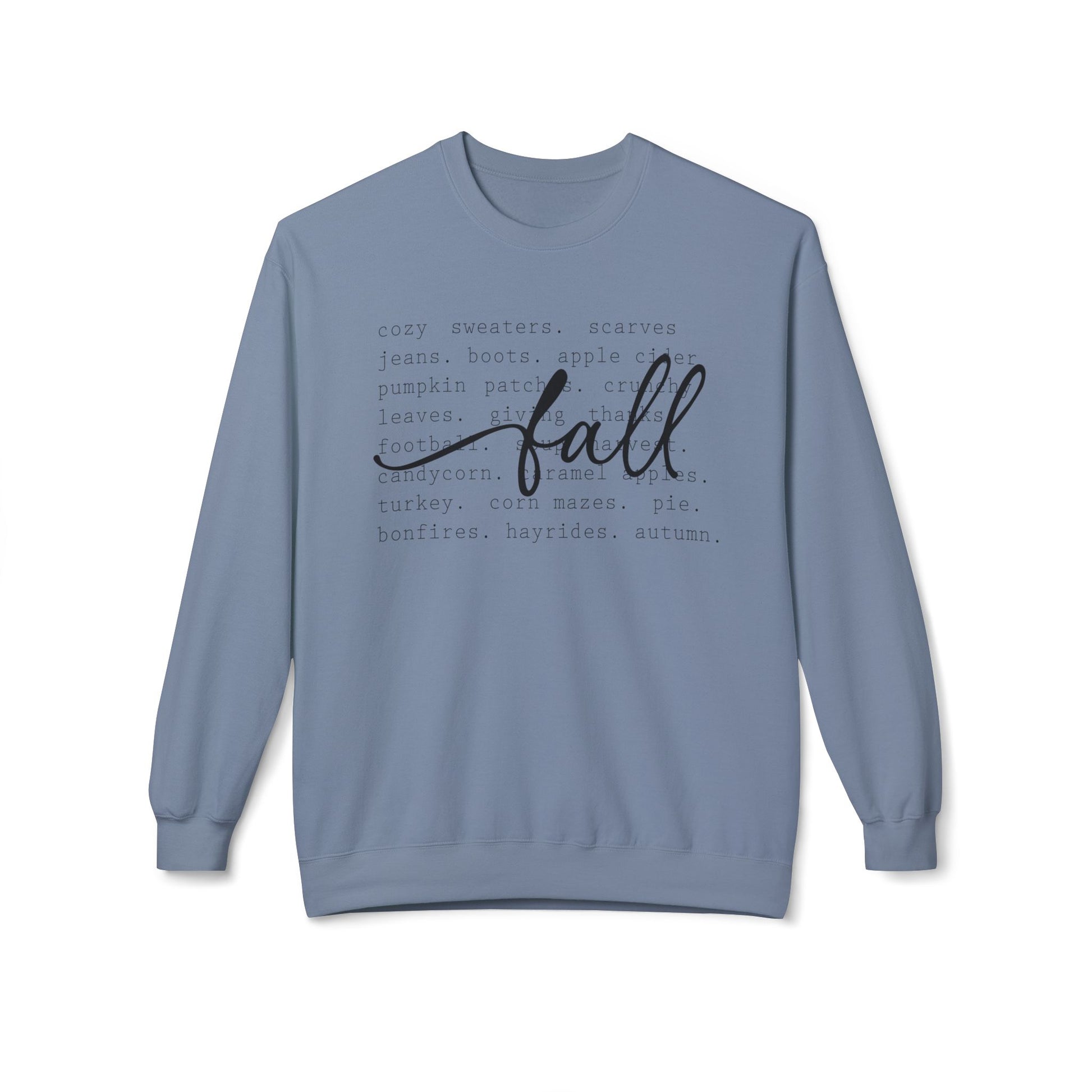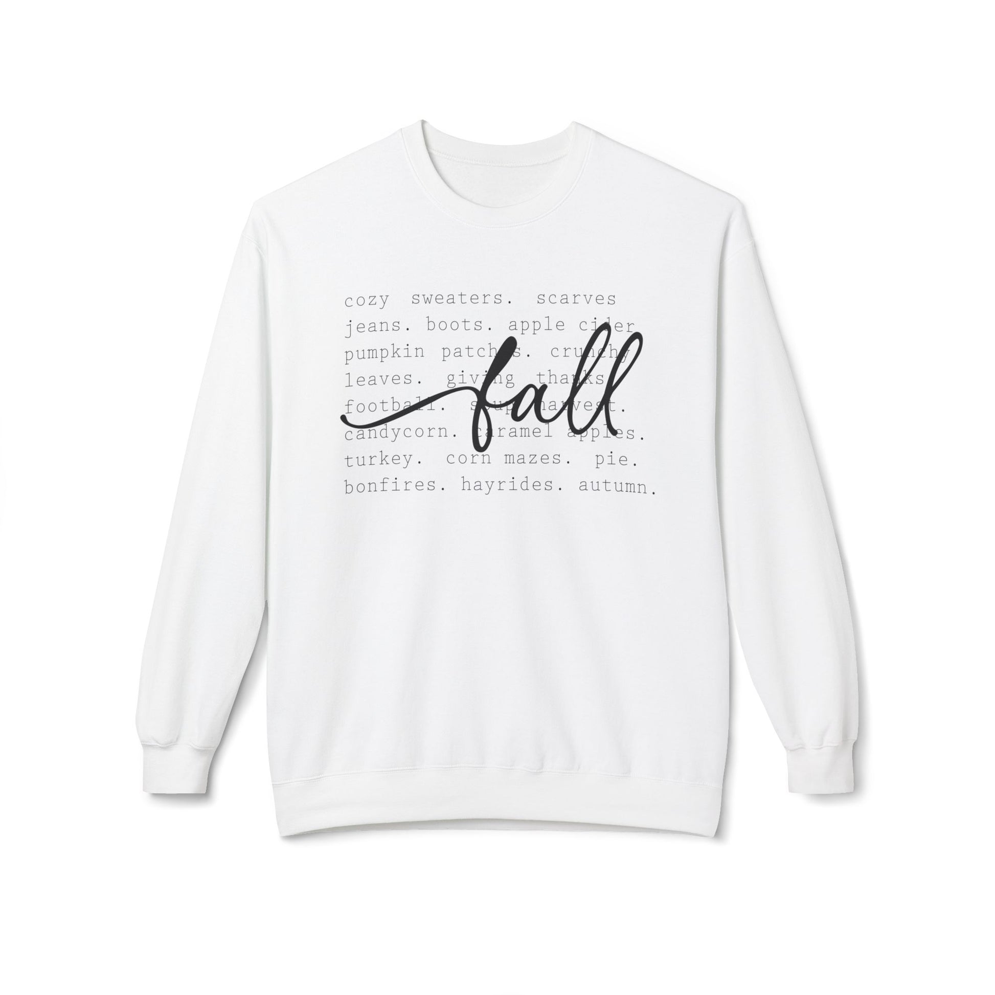 So many wonderful things about fall listed on this cozy Gildan® SF000 unisex sweatshirt. Crafted from a blend of 80% ring spun cotton and 20% polyester, with a brushed interior and 100% ring spun cotton face, it offers unmatched comfort and durability. Featuring a dropped shoulder design for a relaxed fit, this sweatshirt is not only stylish but also eco-conscious. Partnering with Better Cotton to enhance cotton farming worldwide, and made with OEKO-TEX certified low-impact dyes, you can feel good and look even better.