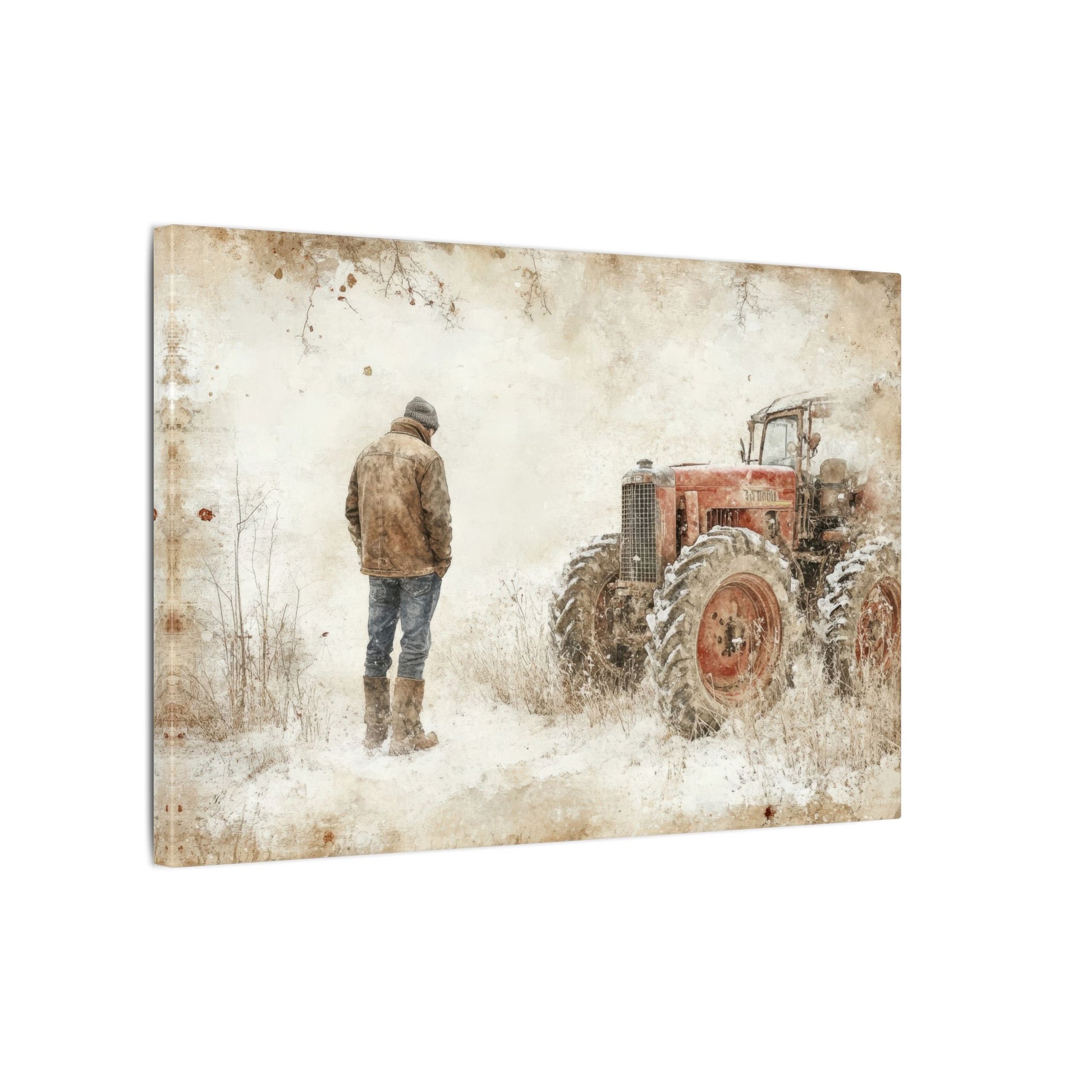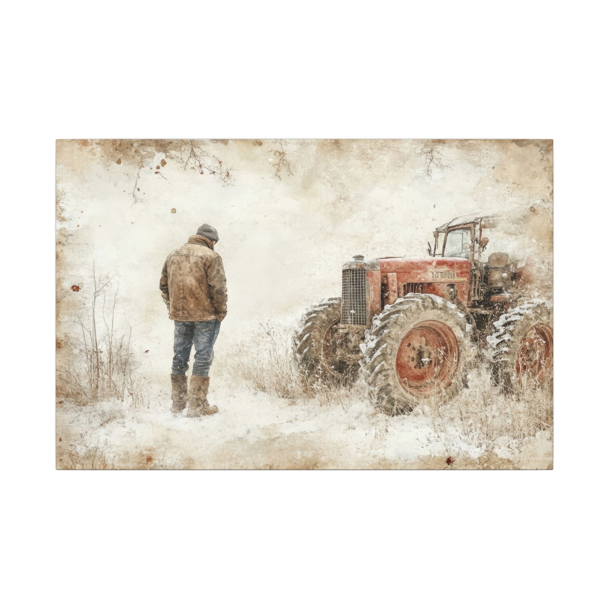 This canvas print is a wonderful look into the life of a farmer, even in the cold making his way out to start his workday. Each matte canvas comes with back hanging already included for convenient placement. The frame is made with profile radial pine that is ethically sourced from renewable forests.