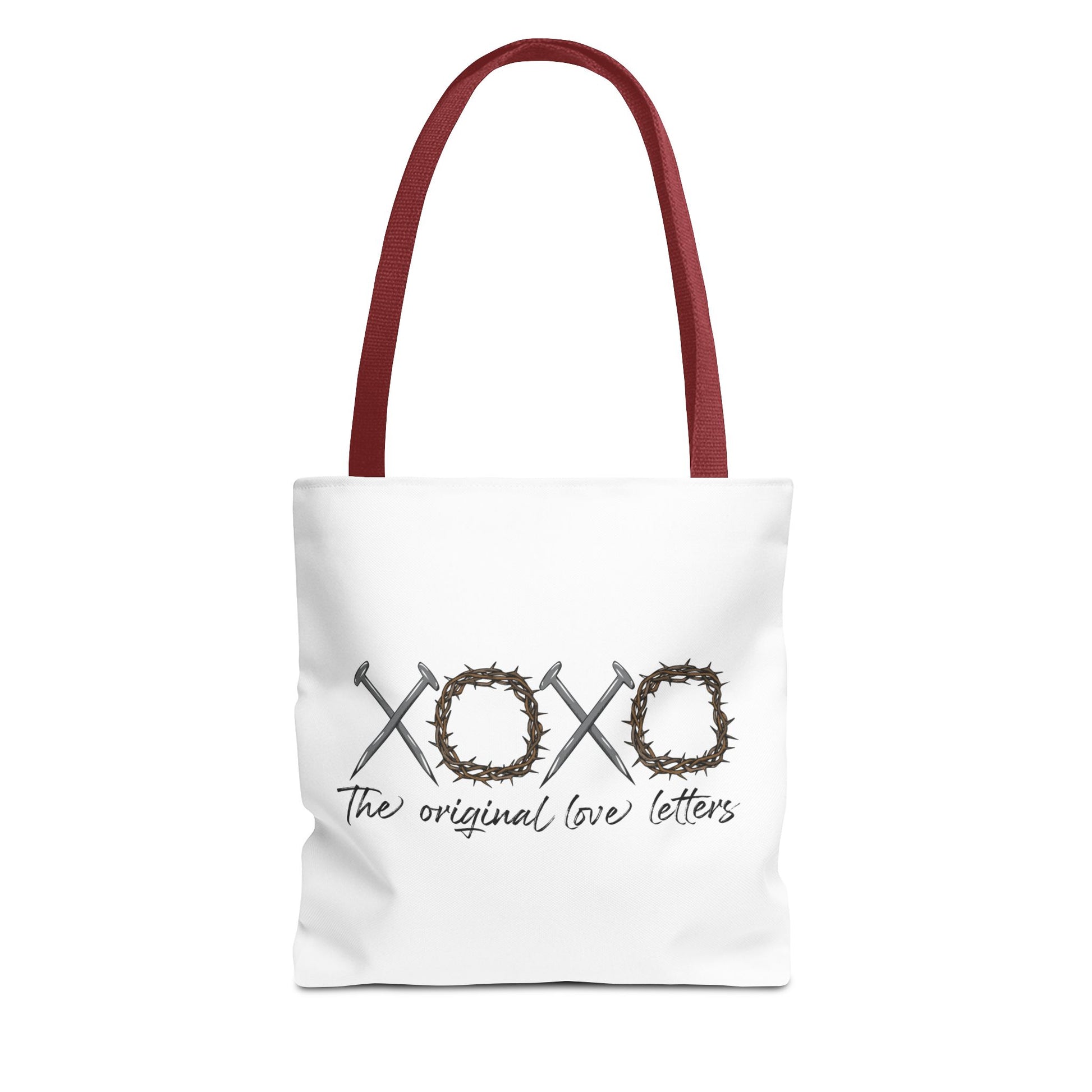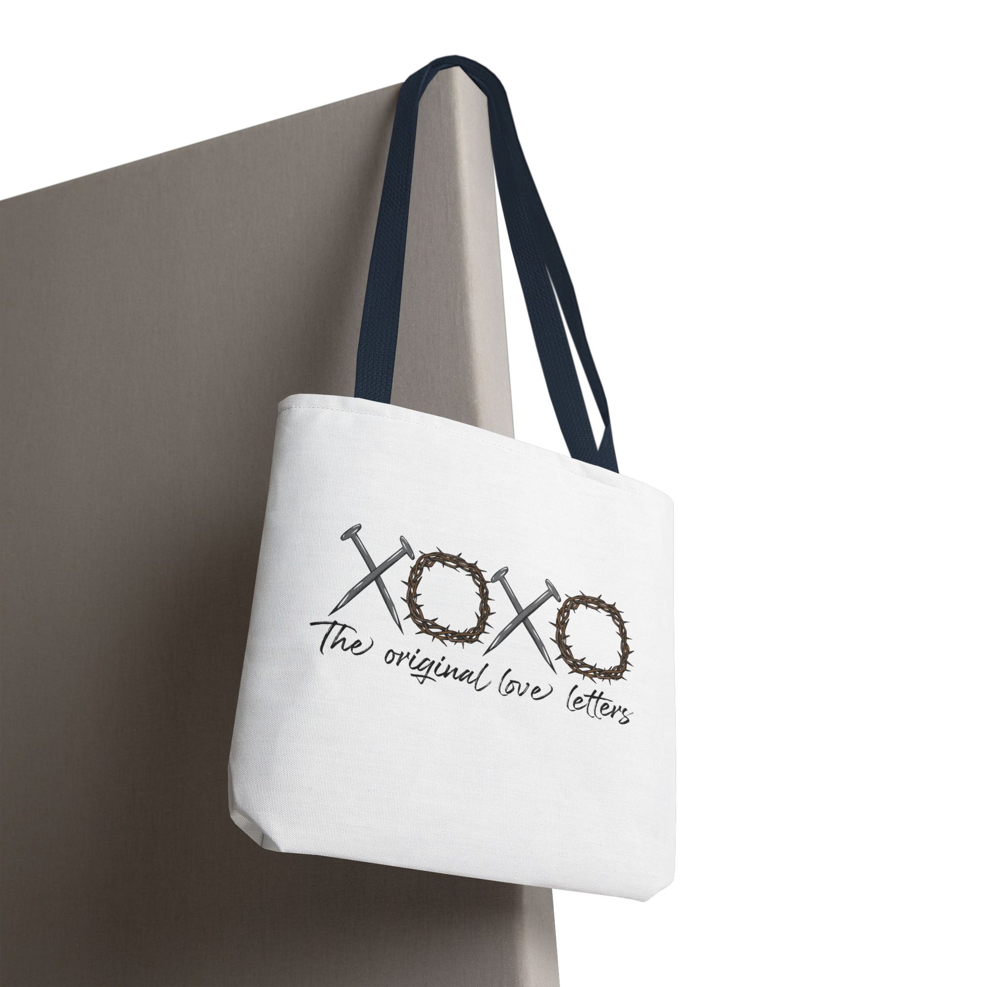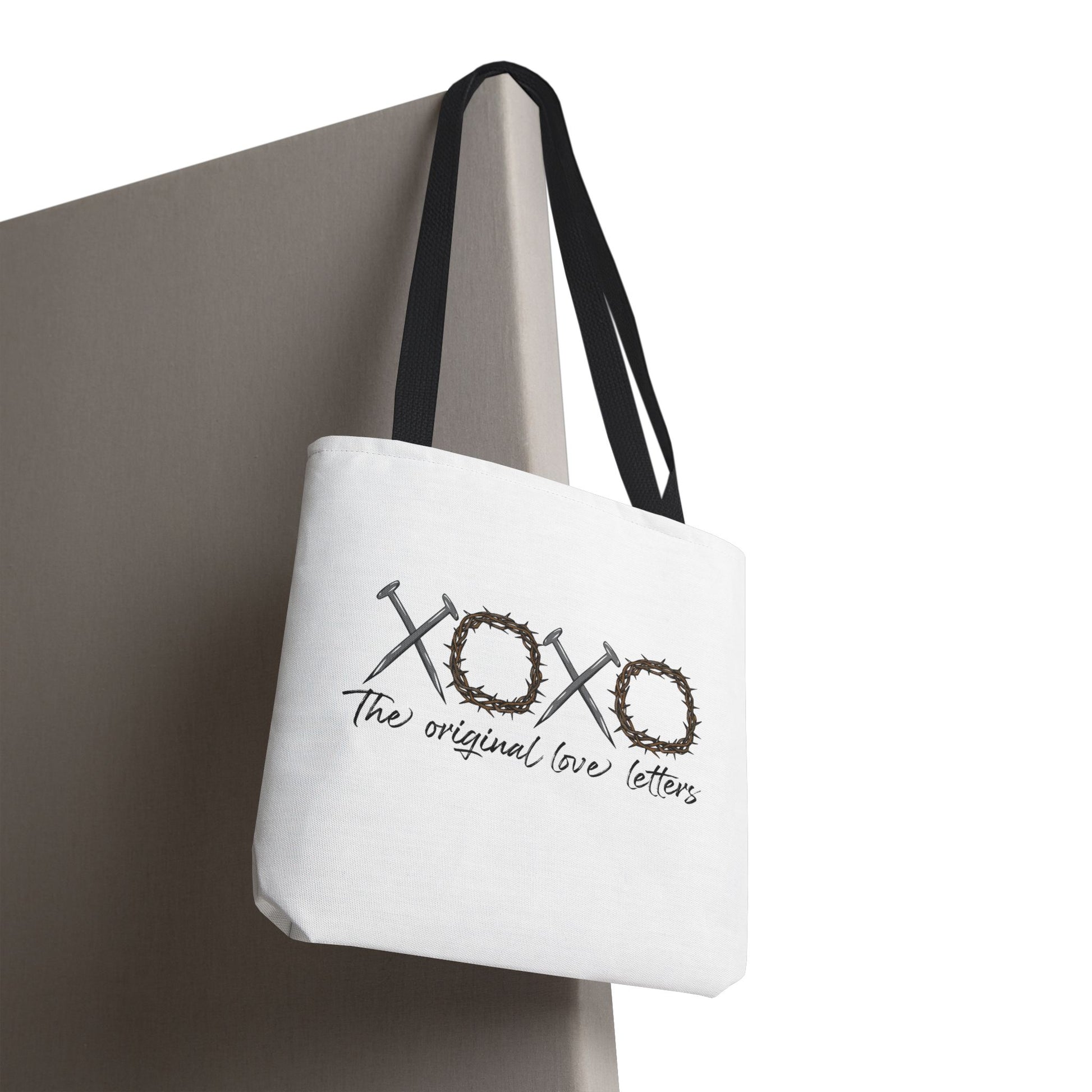 The original love letters, XOXO, spelled out with the crown of thorns and nails to represent the sacrifice Jesus made for us and displayed on both sides. This is a great for carrying all your essentials for a casual outing. Available in 3 sizes to add both functionality and style, these custom-printed tote bags come with multiple handle colors. Made with spun polyester, these bags feature double-stitched seams, cotton webbing straps, and nonwoven laminate lining for high-end durability. Your all-over print is created with dye sublimation for high-end visuals.
