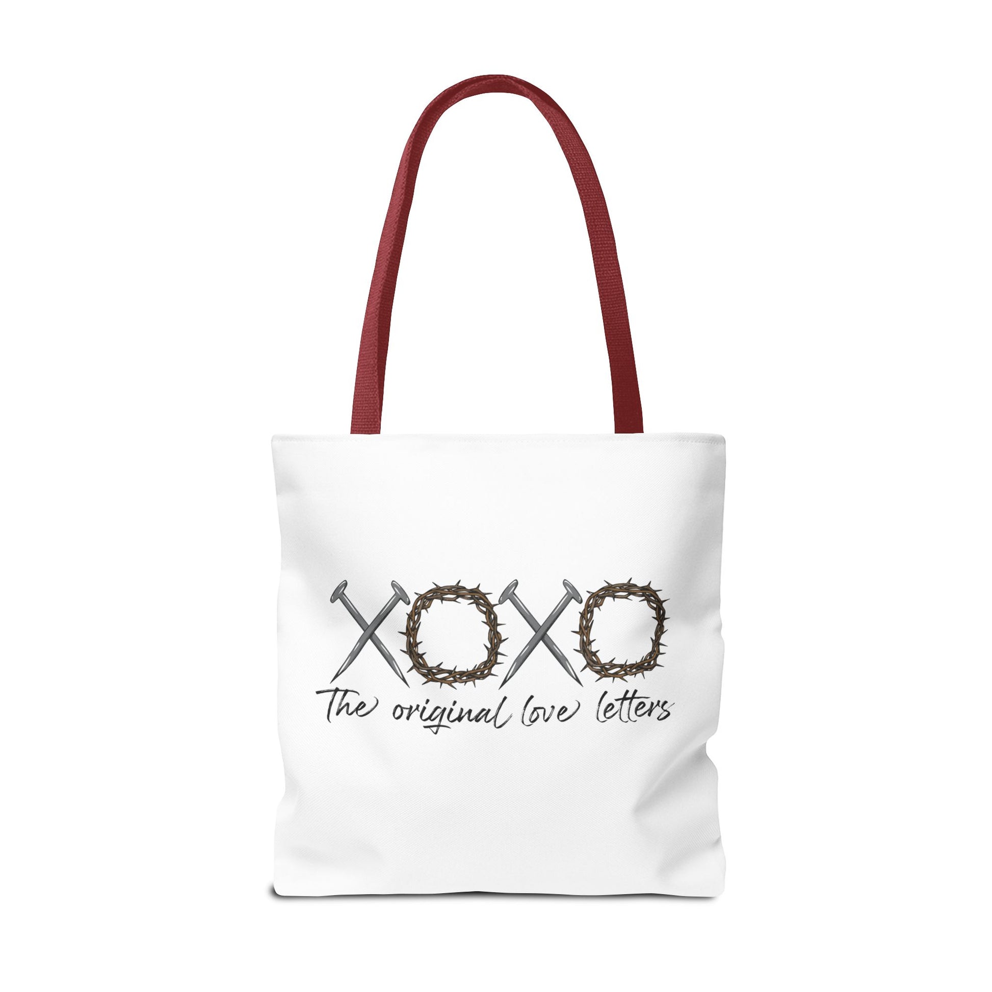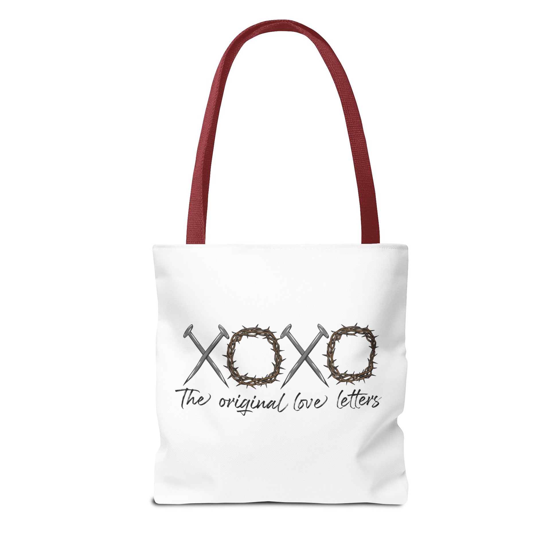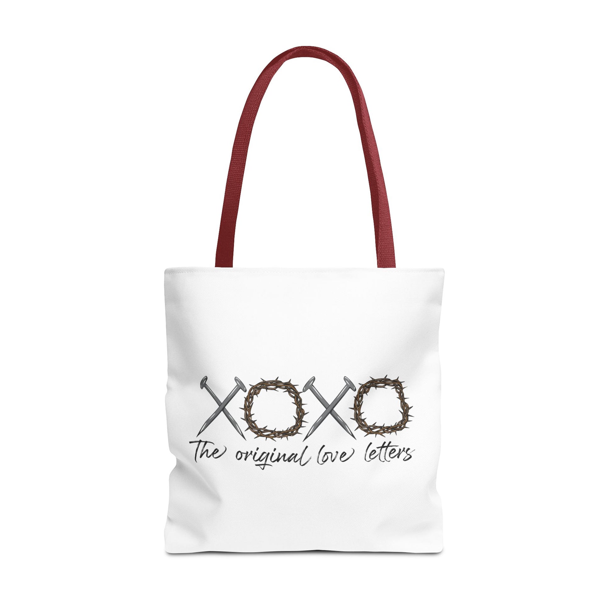 The original love letters, XOXO, spelled out with the crown of thorns and nails to represent the sacrifice Jesus made for us and displayed on both sides. This is a great for carrying all your essentials for a casual outing. Available in 3 sizes to add both functionality and style, these custom-printed tote bags come with multiple handle colors. Made with spun polyester, these bags feature double-stitched seams, cotton webbing straps, and nonwoven laminate lining for high-end durability. Your all-over print is created with dye sublimation for high-end visuals.